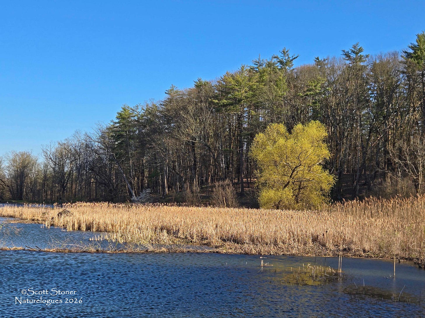 Even with winter hanging on like it has, this tree, growing along a mighty river, is thinking spring. Surrounded as it is by the brown, bare branches of other trees, it stands out like a lantern in a window. And the message it sends is hope.